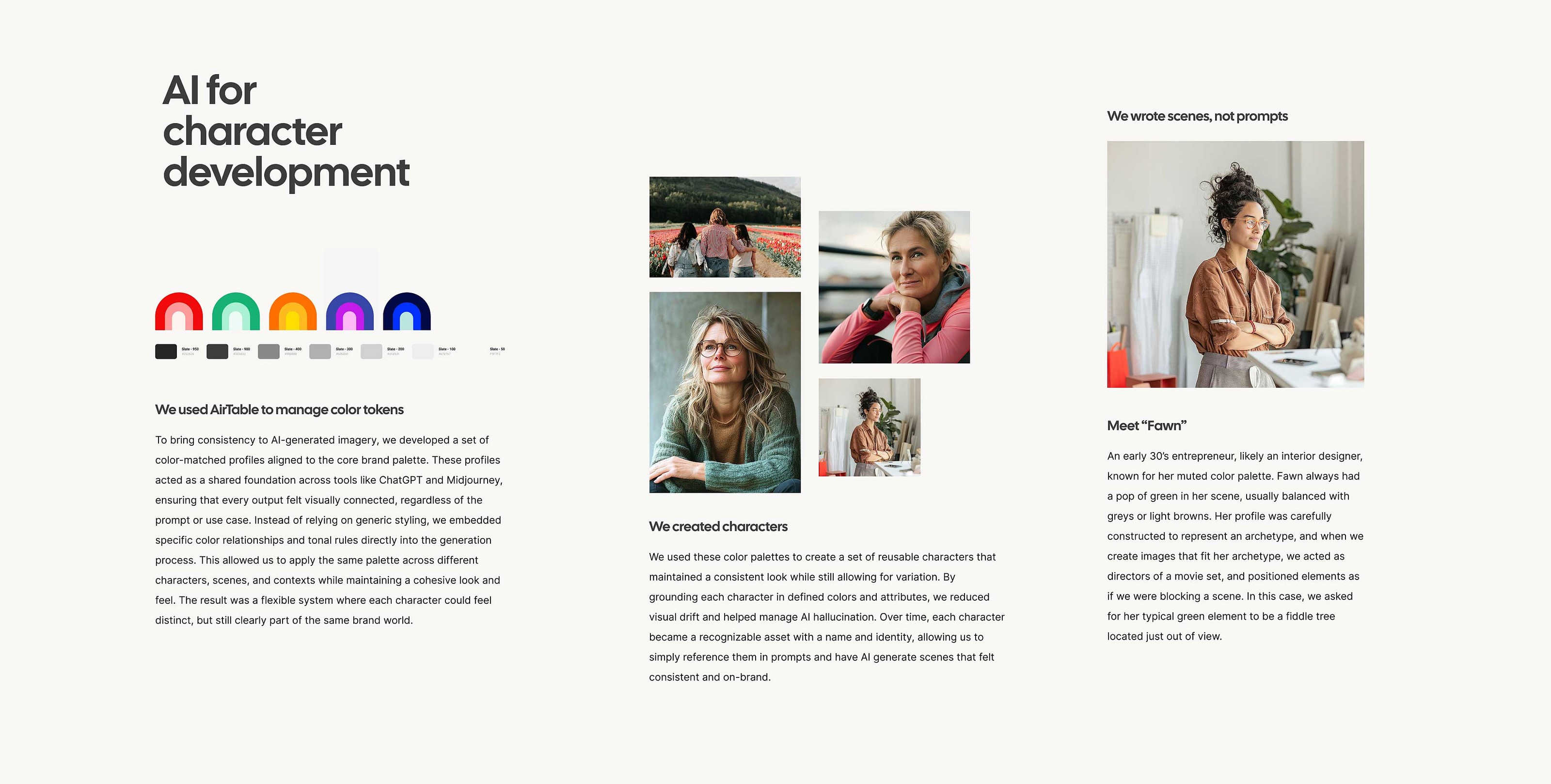 We used these color palettes to create a set of reusable characters that maintained a consistent look while still allowing for variation. By grounding each character in defined colors and attributes, we reduced visual drift and helped manage AI hallucination.